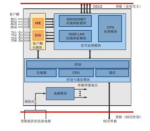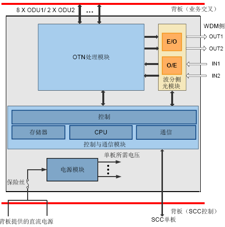 实现将交叉调度过来的者4 路ODU1 信号或者1 路ODU2信号或者1 路ODU2e 和符合WDM 系统要求的标准波长的OTU2 光信号或者OTU2e 之间的相互转换。