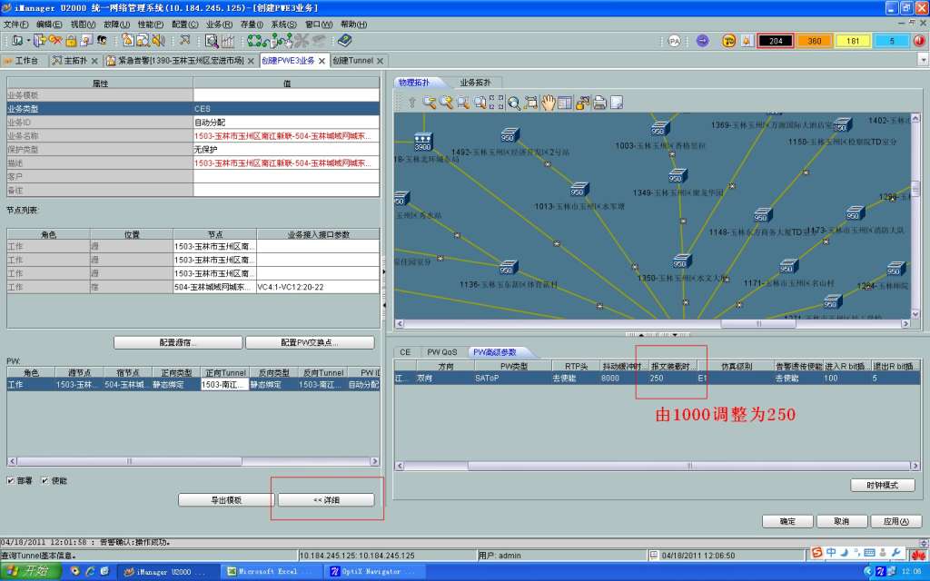 12、创建Tunnel:业务->Tunnel->创建Tunnel,填入Tunnel名称(源网元to宿网元,一般默认的名称长度超过了限定值,所以都要手工填写),确保"创建反向Tunnel"是选中的,有环保护的选中“创建保护组”,双击源网元和宿网元,加入网元列表,点击“配置保护组”,填入保护组名称,类型选择1:1,倒换模式为双端,点击“详细”,在右面列出了每一条Tunnel,每一条都要配置OAM,检测报文类型改为"FFD",检测报文周期(毫秒)为"10",最后点击"确定"创建带保护组的Tunnel。